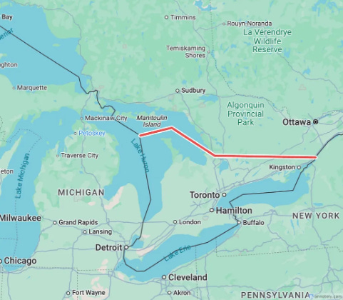 This image has been floating around attached to the “leak” describing the annexation of the most populated region in Canada. The red line represents the adjusted border. Meaning that America has its eyes on establishing a new border, nullifying the 1908 treaty - just north east of Kingston, Ontario. Also home to CFB Kingston and Royal Military College, two assets that I’m sure a potential invader would like to have underfoot.